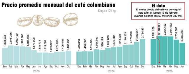 Unido a ello, el sector hoy mantiene unos buenos precios internacionales que se volvieron a trepar por la incertidumbre de las bajas temperaturas en Brasil y los efectos climáticos que impulsaron el precio hacia arriba ante la estrechez del mercado mundial. Hoy el valor interno sigue por los lados de los $3 millones por carga de 125 kilos (ver infográfico).