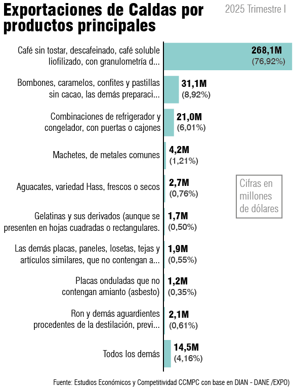 Los reportes de la Cámara de Comercio, con información de la DIAN y del DANE, evidencian que de lo que comercializó Caldas en el primer trimestre de este año, igual a 348,6 millones de dólares puestas en puerto (FOB por sus siglas en inglés), el 24,6% se orientó al mercado de EE.UU., con un monto de 85,9 millones de dólares FOB (ver infográfico).