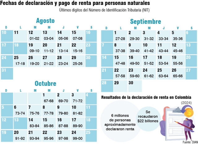 Entre el 12 de agosto y el 24 de octubre se agotan los tiempos para rendir cuentas de este tributo ante la Dirección de Impuestos y Aduanas Nacionales (DIAN), según los últimos dos dígitos de su Número de Identificación Tributaria (NIT).