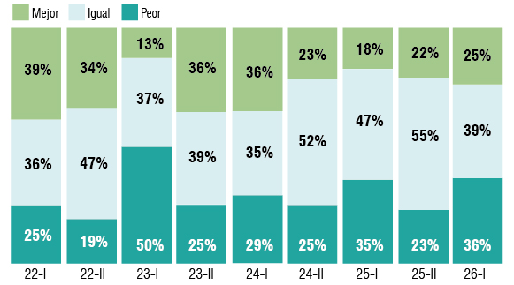 Aunque el 36% espera que la situación empeore, el 25% dice que mejorará y el 39% que permanecerá igual. Esta distribución evidencia que la percepción económica regional sigue siendo cautelosa, con mayor peso en el pesimismo que el optimismo, aunque la proporción de quienes anticipan mejora se recupera levemente frente a la medición pasada.