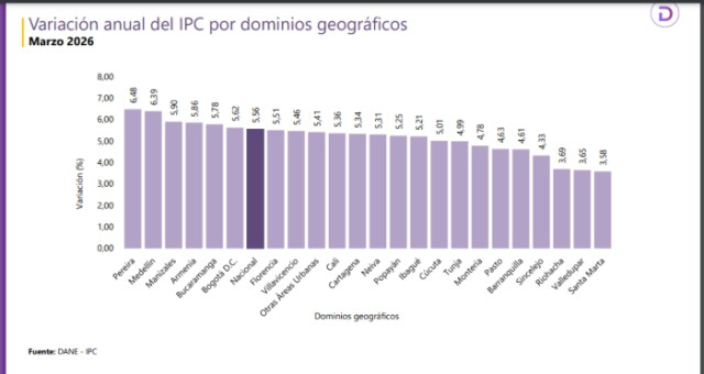 Las ciudades con mayor impacto inflacionario en la variación anual fueron Pereira y Medellín, con tasas del 6,48% y del 6,39% respectivamente.