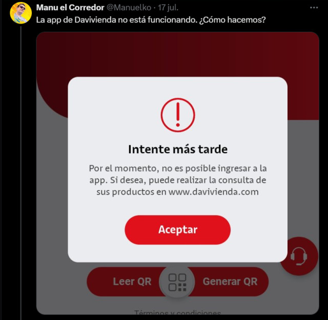 Desde el jueves (17 de julio) de este 2025, usuarios de la red social X han reportado problemas para acceder a la aplicación móvil de Davivienda.