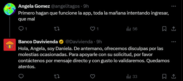 "La app de Davivienda no está funcionando. ¿Cómo hacemos?", preguntó un ciudadano en una publicación de la entidad bancaria.