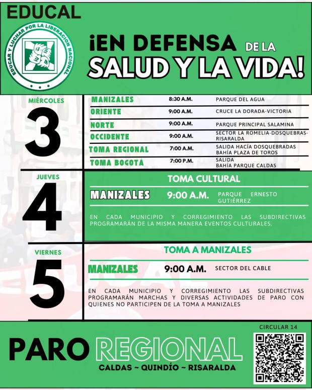 La programación del mismo miércoles, de acuerdo con el sindicato Educadores Unidos de Caldas (Educal) llegará a otras subregiones del departamento, a partir de las 9:00 de la mañana.