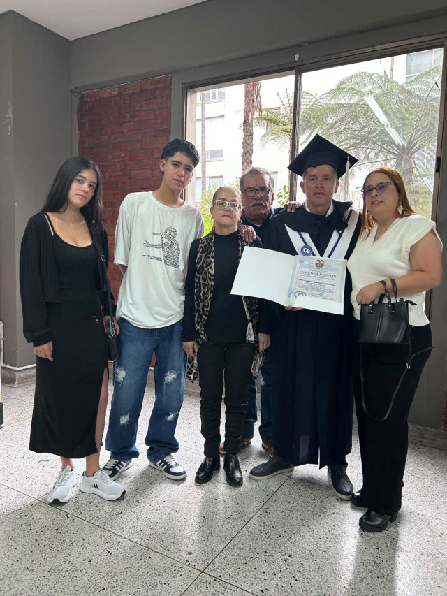 César Augusto Jaramillo trabaja como pintor en la Universidad de Manizales. El pasado 10 de julio recibió su título de bachiller en el colegio Bosque, junto a su familia.