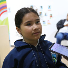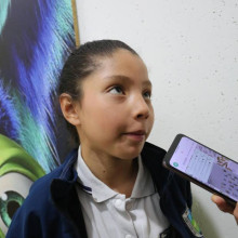 “Me llamo Juliana Cuartas. Tengo ya casi 11 años y estoy en quinto, ssoy en grado quinto. Voy a hablar del gobierno de aula. Nosotros lo elegimos por votaciones. Cuando tenemos candidatas elegimos a nuestro presidente. Las que no tuvieron casi votos, no perdieron, sino que son sus presidentas, secretarias. Votamos en secreto y después contamos los votos para saber quién ganó. Me gusta esta escuela porque siempre nos enseñan jugando, siempre la profe nos enseña algo nuevo y jugamos divertidos juntos”.