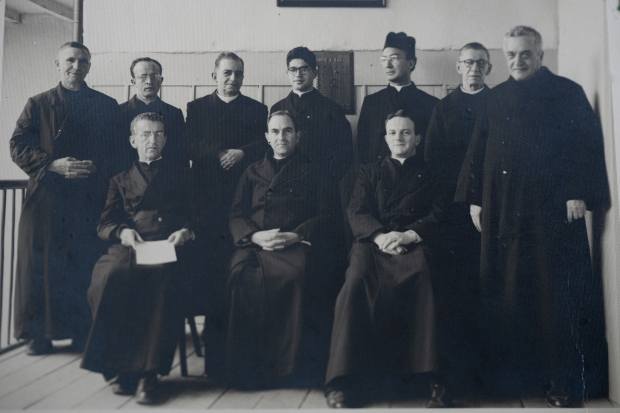 Comunidad del colegio de San Luis Gonzaga (Manizales) el día de su fundación, 8 de febrero de 1954. Sentados: P. Antonio J. Villegas. Ministro. / P. Roberto Martínez, Rector / P. Antonio Bernal, Prefecto. De pie: H. Andrés Alcibar / P. Antonio Silva, asesor espiritual de los alumnos./P. Lino Zuluaga /H. Leonardo Ramírez / P. Ignacio Guzmán /H. Francisco Ramírez / P. Norberto Ramírez