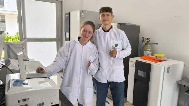 Foto I Cortesía Universidad de Manizales I LA PATRIA  Anna Rau, de la Universidad de Rostock, y Julian Etienne Koop, de la Universidad de Lübeck, ambas en Alemania, en el Laboratorio de Proyectos de Investigación de la Universidad de Manizales.