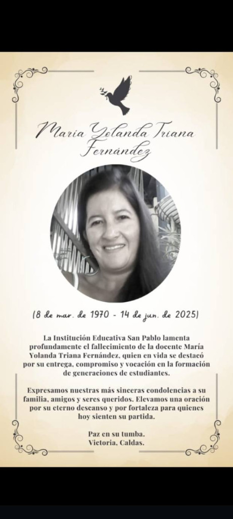 El plantel expresó: “La Institución Educativa San Pablo lamenta profundamente el fallecimiento de la docente María Yolanda Triana Fernández, quien en vida se destacó por su entrega, compromiso y vocación en la formación de generaciones de estudiantes”.