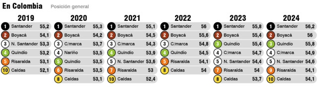 Así mismo, expresa: "Si bien su posición nacional en el ranking regresó al décimo lugar en el 2024, la misma del 2019, este hecho no debe interpretarse como un retroceso, sino como una muestra del progreso general del sistema educativo en el departamento".