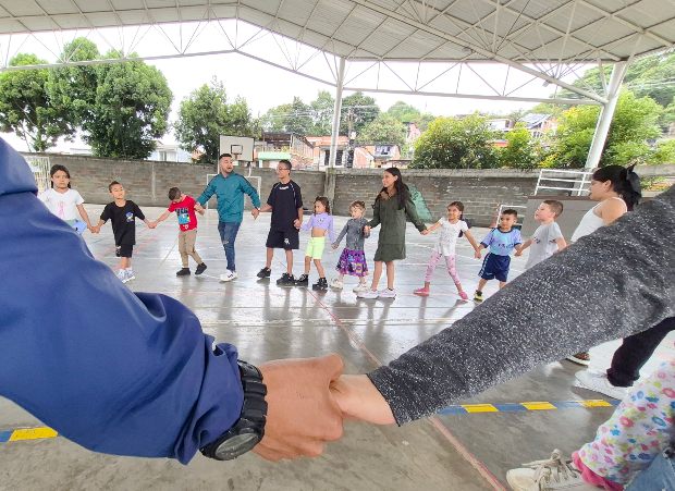 Juan Diego Bermúdez, del programa Manizales Deporte e Inclusión de la Alcaldía. Canta fuerte: “Agua de limones, vamos a jugar; el que quede solo, solo quedará”. Todos los niños repiten y van de izquierda a derecha, tomados de las manos. Canta de nuevo, y van de derecha a izquierda.