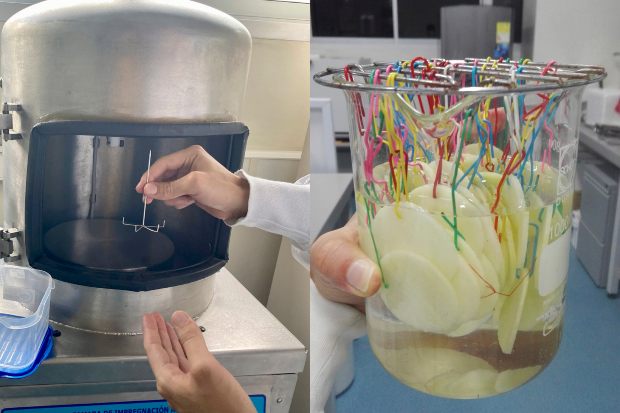 2.“Este equipo somete la cidra a condiciones de vacío para retirar el aire entre las células. Al recuperar la presión ambiental la solución enriquecida con vitamina C y microorganismos probióticos penetra en el fruto”, explica el investigador Londoño.