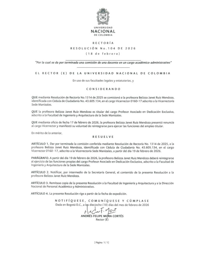 La resolución 104 del 2026 confirmó la salida de Belizza Ruiz Mendoza de la Vicerrectoría de la Universidad Nacional de Colombia sede Manizales.