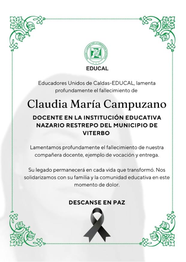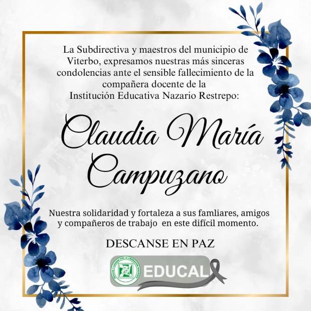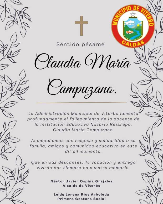Por ejemplo, la Alcaldía de Viterbo manifestó en su página de Facebook: “La Administración municipal lamenta profundamente el fallecimiento de la docente de la Institución Educativa Nazario Restrepo, Claudia María Campuzano”.