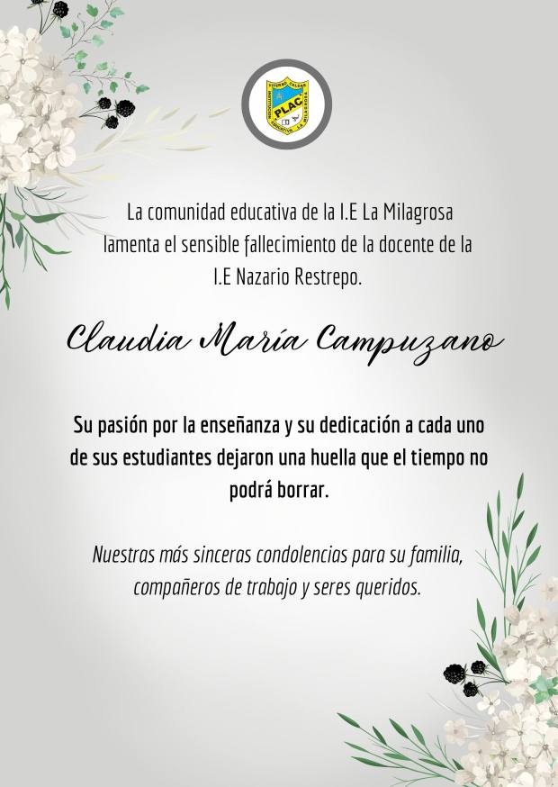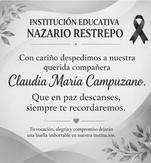 Por su parte, el colegio Nazario, reconocido por su labor de años en el Occidente Próspero del departamento, igualmente publicó un pésame: “Con cariño despedimos a nuestra compañera Claudia María Campuzano, que en paz descanses, siempre te recordaremos”.