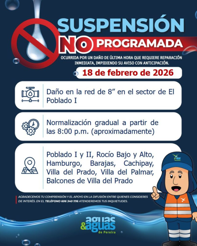 La empresa Aguas y Aguas de Pereira informó que la afectación se debe a un daño en una red de 8 pulgadas ubicada en el sector de El Poblado I, lo que obligó a interrumpir el suministro mientras se realizan las reparaciones correspondientes.