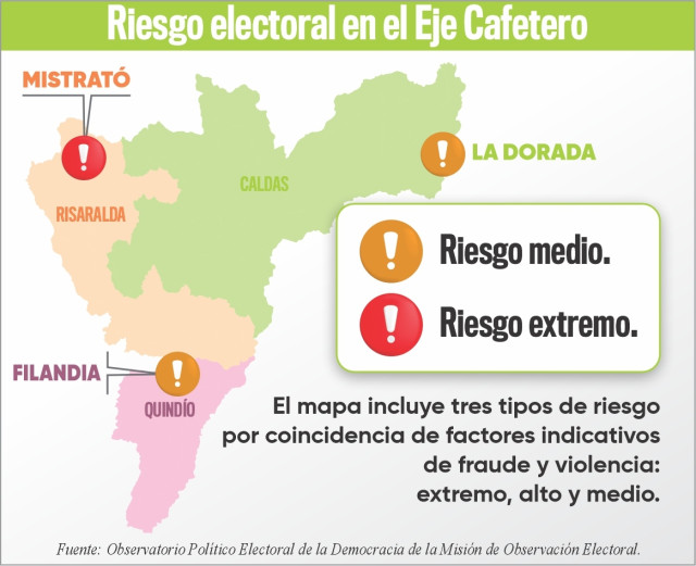 "De manera tradicional, el Eje Cafetero ha estado como desaparecido, en buena hora, de los niveles de riesgo electoral. Sin embargo, para esta edición sí tenemos un repunte de tres municipios", analiza Rubiano.