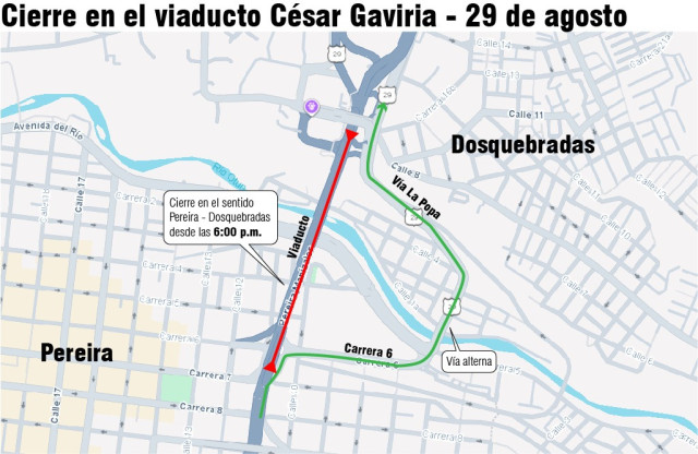 Las restricciones viales empezarán desde las 6:00 p. m. del viernes (29 de agosto). De acuerdo con el secretario de tránsito de Dosquebradas, Yeison Palacio, solo funcionará un carril del Viaducto sentido Pereira - Dosquebradas.