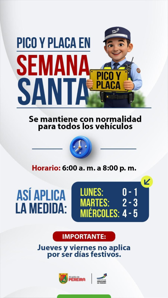 La medida de pico y placa continuará operando con normalidad en Pereira durante los primeros días de la Semana Santa, según informaron las autoridades de movilidad.