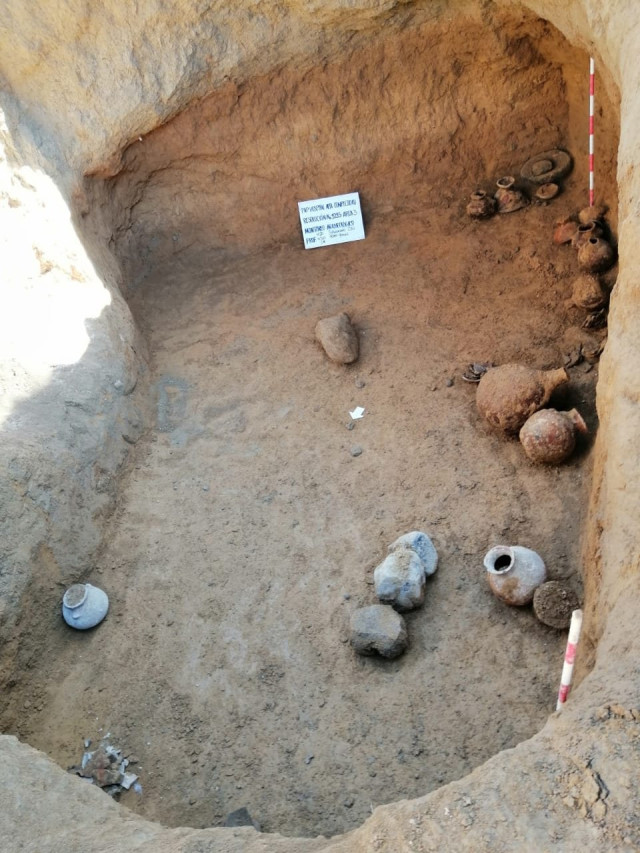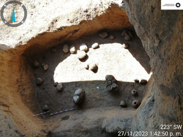 Entre los objetos hallados se encuentran vasijas completas y fragmentadas, cuencos, copas, herramientas líticas (de piedra), pigmentos naturales, textiles y volantes de hilar, conocidos como volantes de huso.