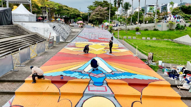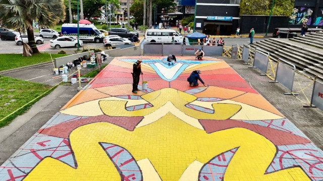 En la Plazoleta cívica Ciudad Victoria, el colectivo Revolucionarte está pintando un mural de piso sobre la identidad de Pereira. Esperan entregarlo el 20 de diciembre
