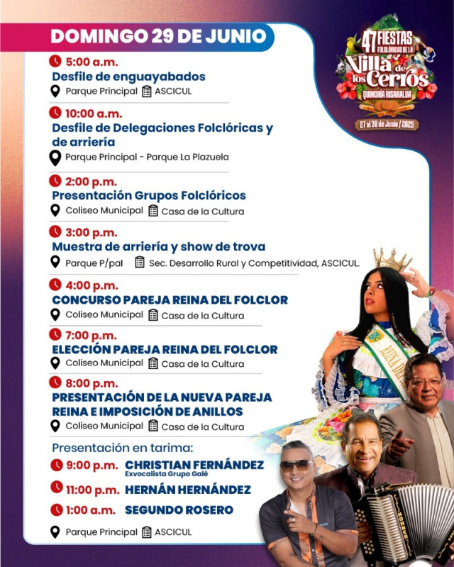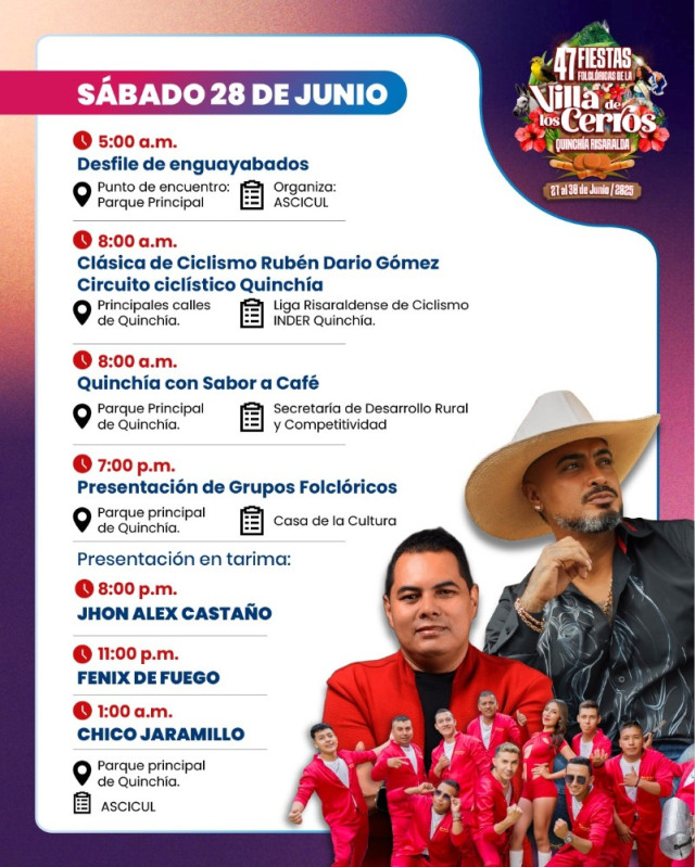 En la noche, el ambiente se transforma con una de las jornadas más esperadas: el concierto de Jhon Alex Castaño, quien se presentará por primera vez en Quinchía, junto a Chico Jaramillo y el grupo caucano Fénix de Fuego, con una propuesta de cumbia que ha ganado gran acogida en la localidad.