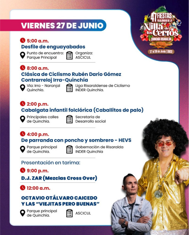 La noche del viernes estará animada por DJ Zar, y la presentación de Octavio Otálvaro Caicedo y su tradicional programación de Viejitas pero buenas.
