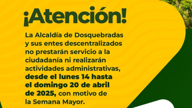 "No tendremos atención al público. Esta disposición permitirá que los funcionarios disfruten la Semana Mayor con sus familias y acompañen diversas actividades de la Administración Municipal. Les solicitamos adelantar sus trámites y peticiones, las cuales serán recibidas hasta el 11 de abril.”