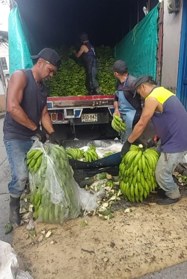 El emprendimiento es liderado por Eduar Jaramillo. Su negocio contacta a productores del municipio y visita sus fincas para comprar de primera mano. Una vez llegan a las plantaciones, Eduar y sus familiares se encargan de cortar los racimos que se llevarán a su centro de acopio.