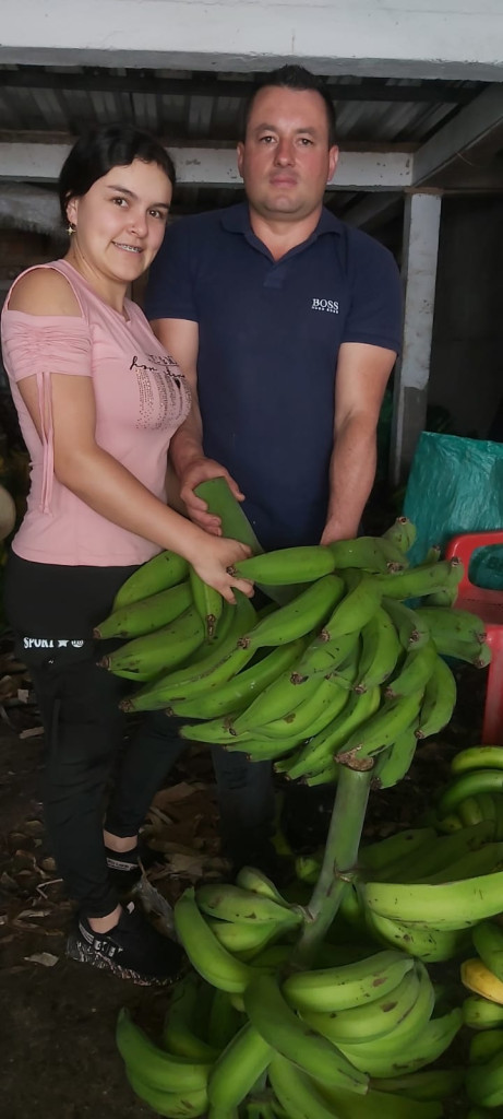 Los esposos Eduar Jaramillo y Paola Trujillo con racimos de plátano producidos en el campo neirano.