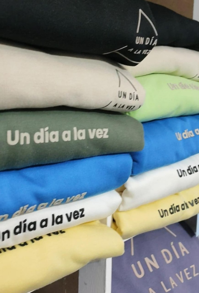 - Buzos con la frase "Un día a la vez", con o sin el logo.