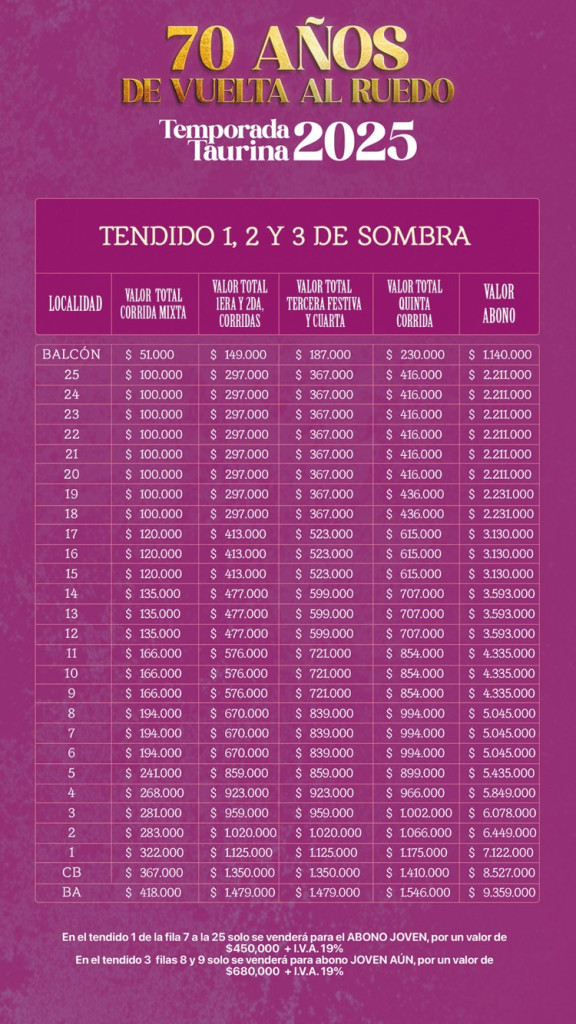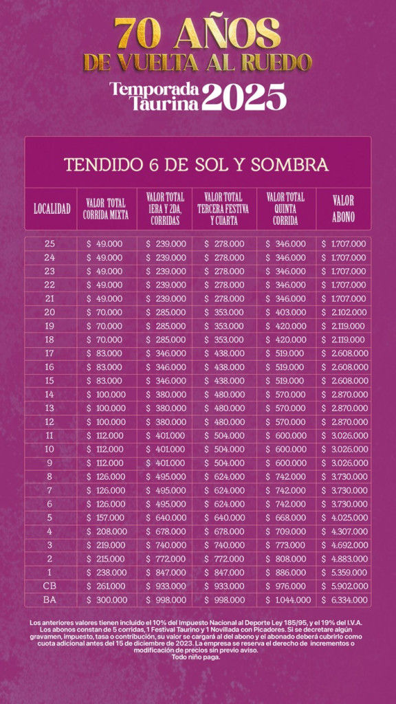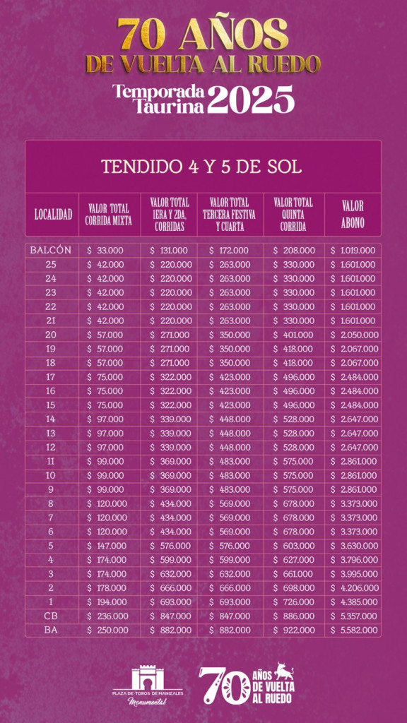 Cormanizales anunció en la mañana de este viernes (6 de diciembre) la boletería suelta para los 70 años de la Temporada Taurina de Manizales, que será del 5 al 11 de enero de 2025.