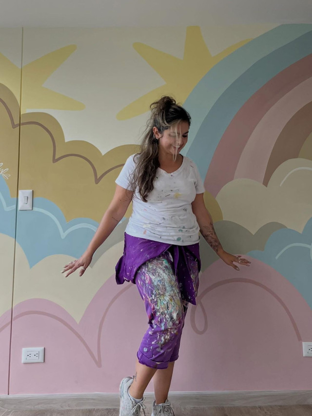 Durante el confinamiento, en casa de su papá pidió permiso para intervenir una pared. Tomó unas pinturas que había en casa y comenzó a dibujar flores junto a su hijo. Publicó el proceso en redes sociales y las reacciones llegaron de inmediato. Personas y empresas empezaron a reconocer en ese trabajo una forma poderosa de comunicación visual.