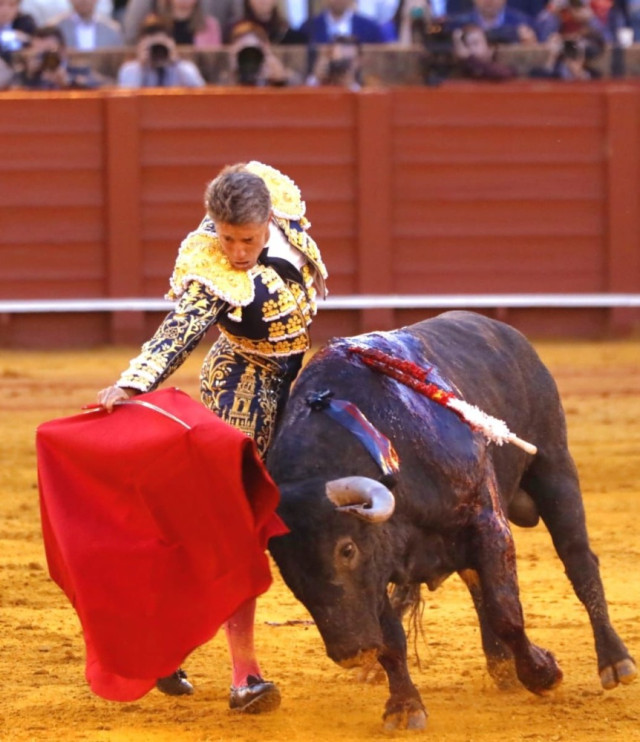 Manuel Escribano, en la lidia a 'Mosquetón', extraordinario ejemplar del hierro de Victorino, al que le cortó las dos orejas el sábado pasado en Sevilla.
