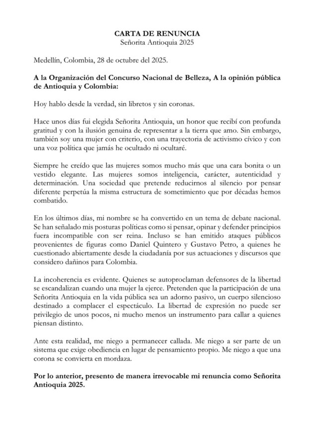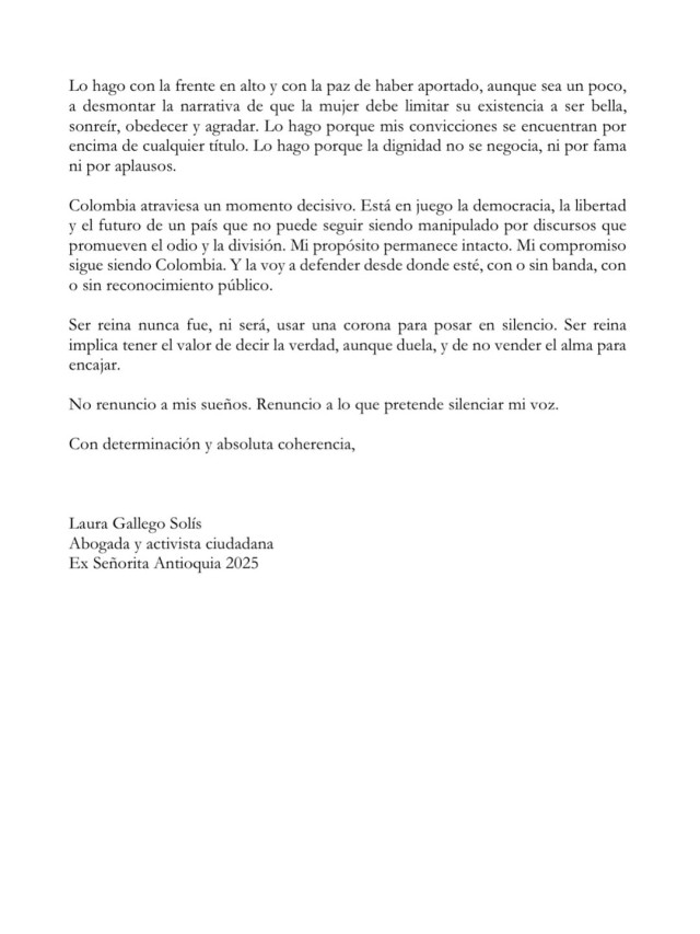 El 28 de octubre de 2025, Laura Gallego publicó un comunicado en redes sociales anunciando su renuncia irrevocable al título de Señorita Antioquia.