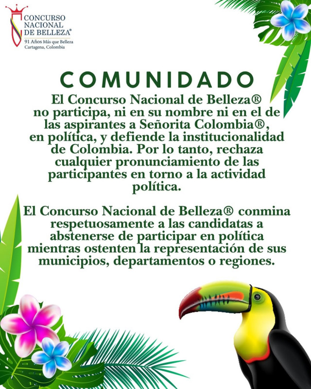 Por su parte, la organización del certamen emitió un comunicado señalando que no participa “en política” ni respalda pronunciamientos de candidatas, y que conmina a abstenerse de participar en política mientras ostenten la representación del municipio, departamento o región.