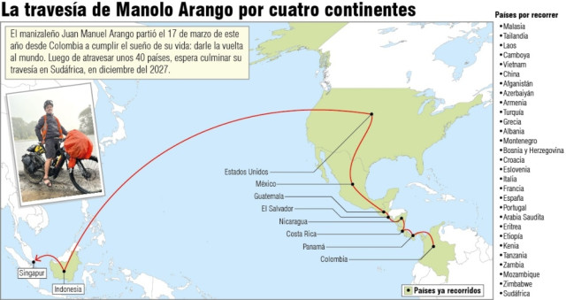 América fue el primer continente completado en el recorrido de Manolo Arango por el mundo. Ahora se encuentra en Asia, luego atravesará Europa y terminará en África.