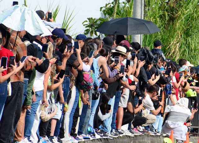No pueden faltar sus celulares, uno que otro trípode, los fotógrafos aficionados y profesionales, los ponchos, sombreros, sombrillas, las charlas entre desconocidos que terminan compartiendo 30 minutos de adrenalina, los vendedores ambulantes.