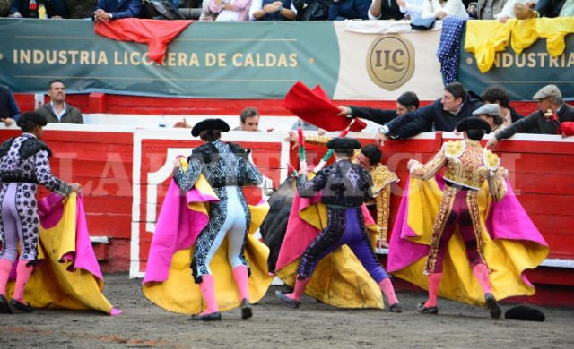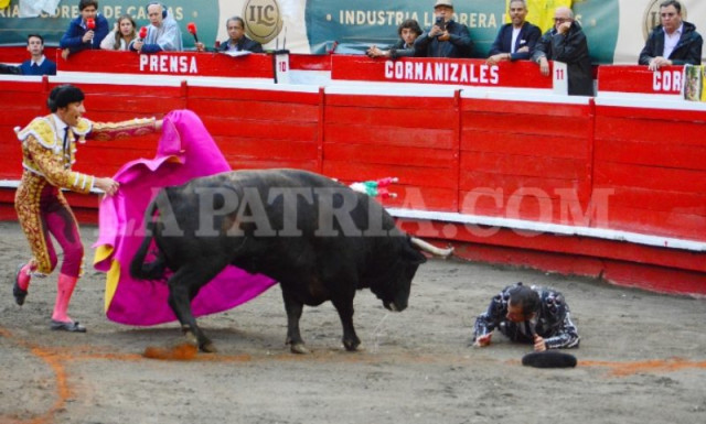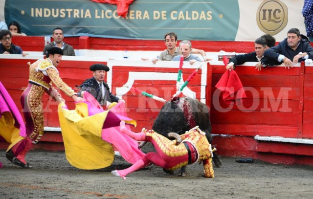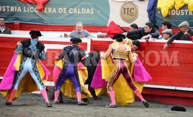 Escena 1: Luego de los pares de banderillas en el toro Castellano, el subalterno Iván Darío Giraldo cayó al piso.