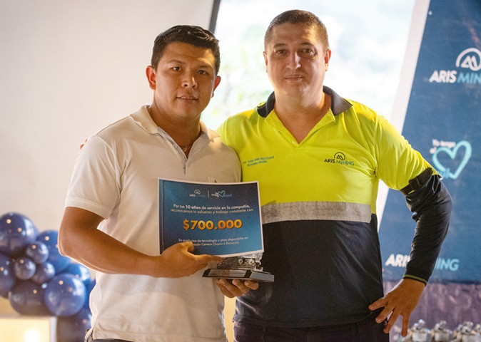 Arley Naranjo, técnico de Mantenimiento, y Alejandro Gálvez, gerente general de Aris Mining Marmato.