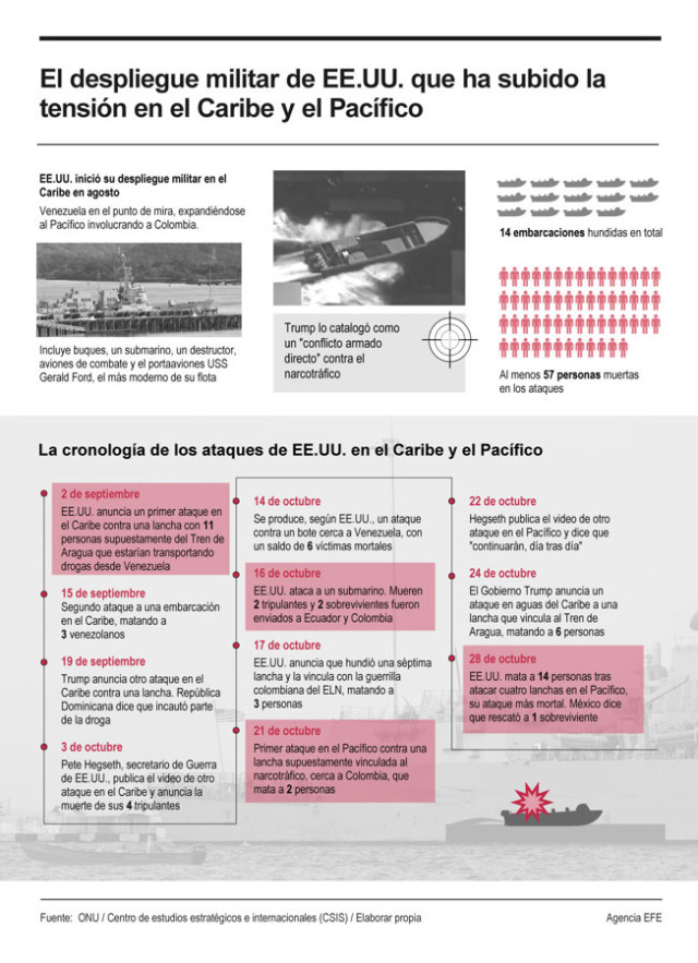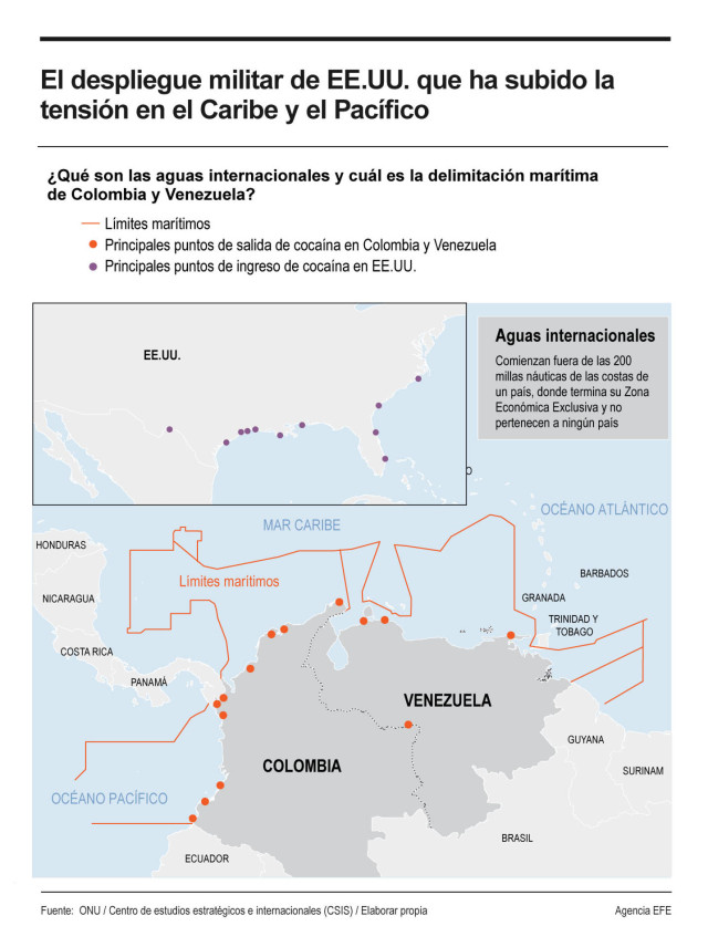 Tras la llegada del grupo de ataque del portaaviones USS Gerald Ford, que se espera para la próxima semana, EE.UU. pasará a tener ocho buques de guerra (seis de ellos destructores), tres buques anfibios y un submarino. Un total de 13 efectivos navales, algo que ni siquiera se dio en la invasión a Panamá en 1989 o en la invasión a la isla de Granada en 1983.