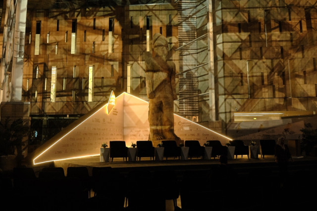 La ceremonia arrancó con la llegada de los invitados de honor al recinto especialmente habilitado en el exterior del GEM, cuya decoración e iluminación estaban inspiradas en las pirámides de Guiza, testigos de excepción y a veces protagonistas del espectáculo desde sus majestuosa altura.