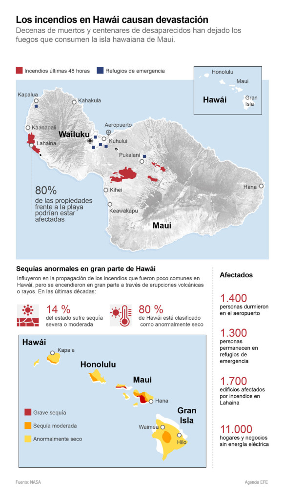 La fuerte sequía que ha afectado a las islas en los últimos meses, así como los fuertes vientos procedentes del huracán Dora, han provocado que las llamas se extendieran a una velocidad mucho mayor, según las autoridades locales, dificultando además las labores de extinción.