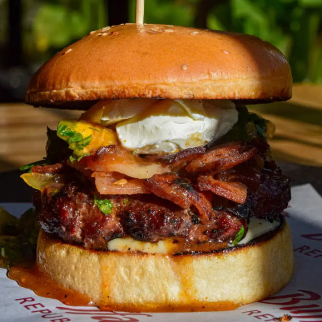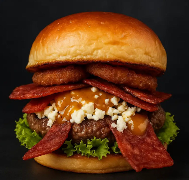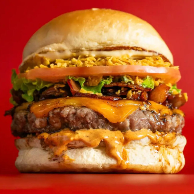 Porky Balboa: doble carne de res tipo smash, pan brioche suave, vegetales frescos, mayonesa de parmesano, chicharrón horneado al vapor y queso cheddar fundido.