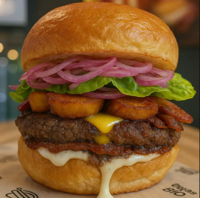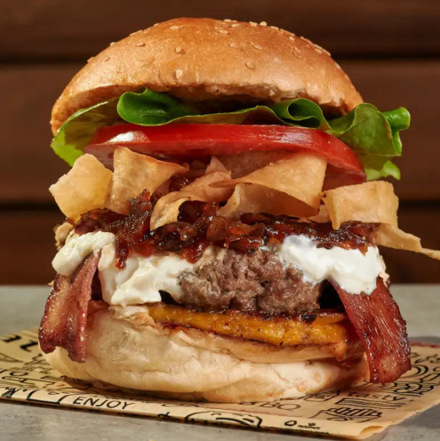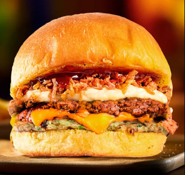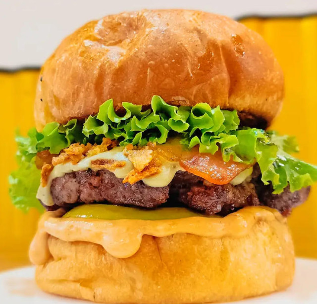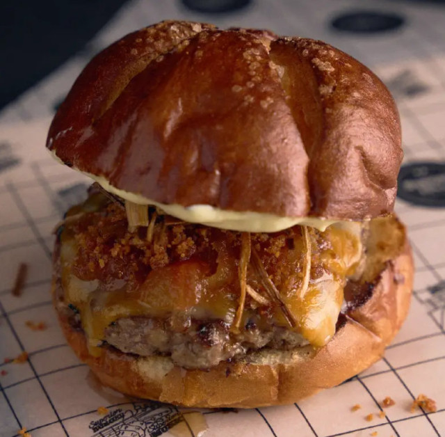 La Milf: pan brioche untado en su base con una mayobacon, doble carne smash, queso cheddar americano, dip de queso y frutos amarillos, salsa barbecue de tamarindo y cebolla crispy.