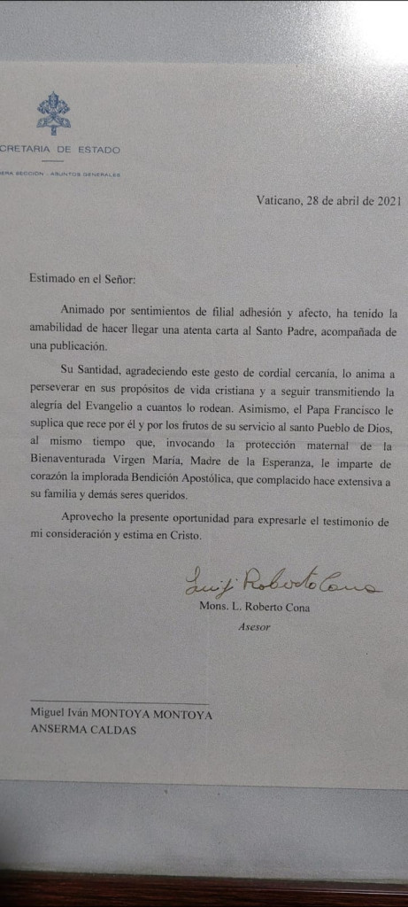 Y se lo envié al Vaticano. Y junto con el libro le envié una carta y le dije a su santidad que para yo tener la certeza y la seguridad que el libro había llegado a él me enviara una foto.