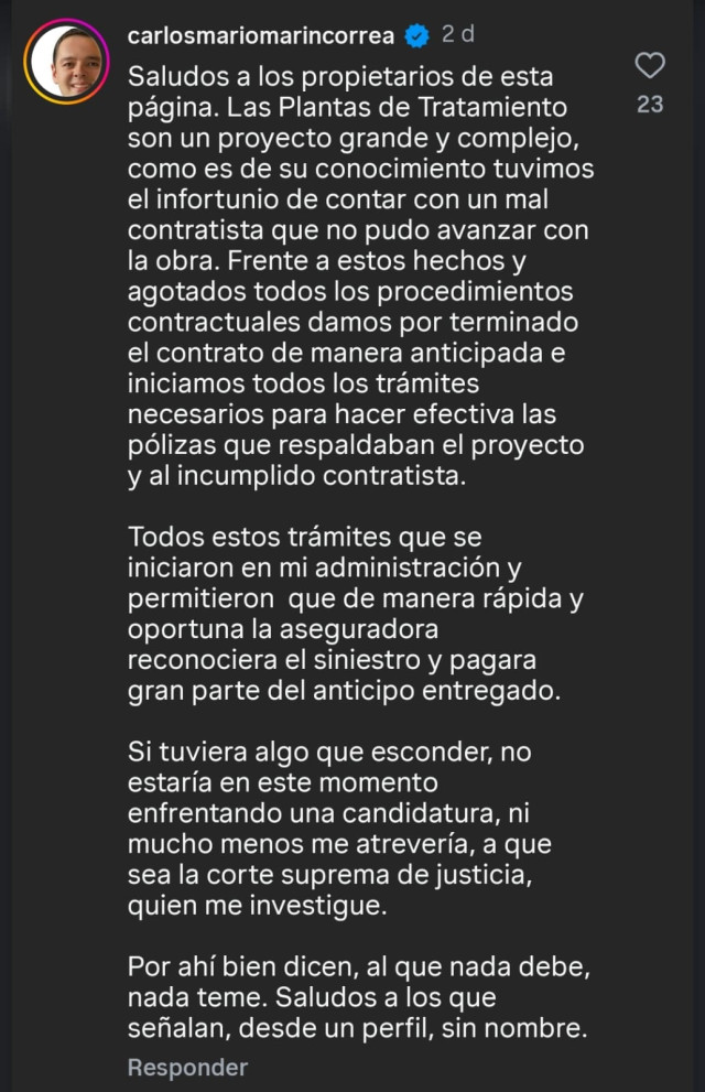 Carlos Mario Marín no tardó en responder. En un comentario en la misma publicación, atribuyó el fracaso al contratista, la firma mexicana Fypasa, y aseguró haber adelantado los trámites para terminar el contrato y activar las pólizas.