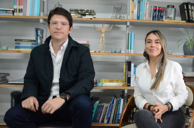 Miguel Uribe Turbay, senador y precandidato presidencial por el Centro Democrático, junto a la diputada de Caldas por el Centro Democrático, Karen Suárez, durante una visita a las instalaciones de LA PATRIA.