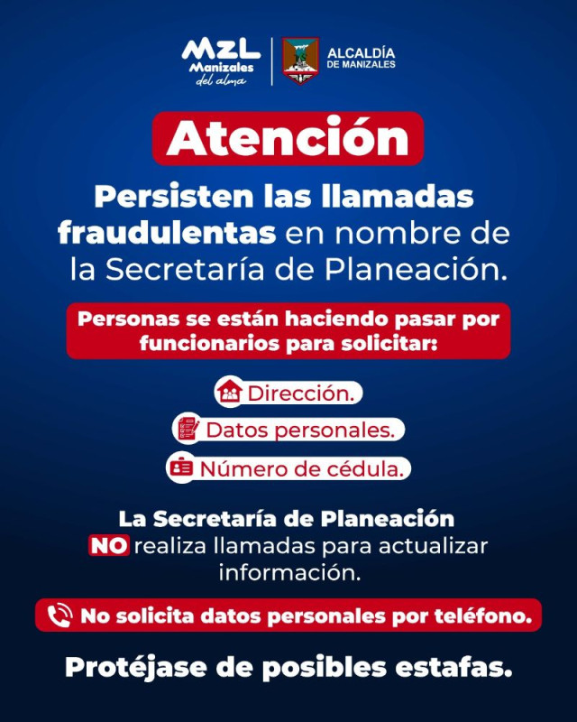 La Alcaldía de Manizales informó que a través de las llamadas telefónicas se solicita información personal a los ciudadanos como: número de cédula, dirección de residencia y otros datos personales.