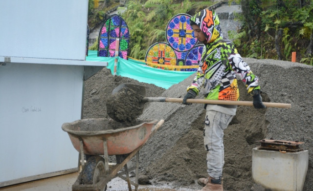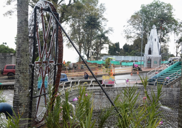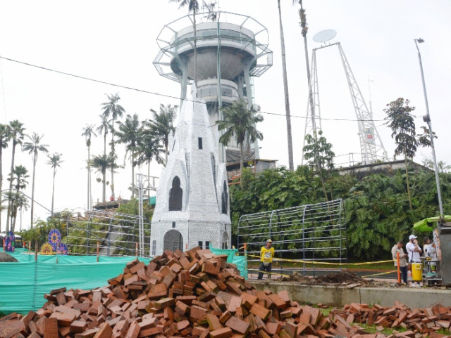 En el bulevar de Chipre, donde la renovación urbana avanza entre materiales de construcción, la réplica de la Catedral se levanta detrás del obrero Jorge Javier Zuluaga, quien continúa su labor diaria en una escena que evidencia el paralelo entre la obra y la instalación del alumbrado navideño en Manizales.